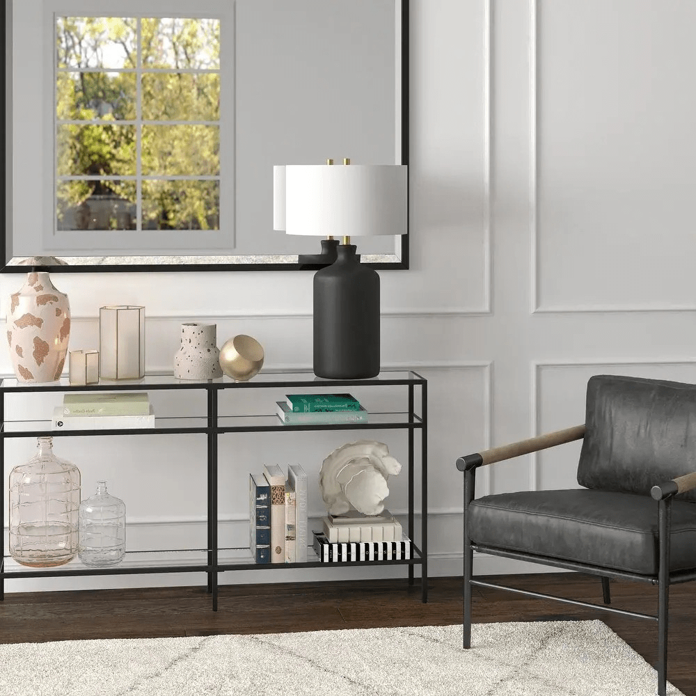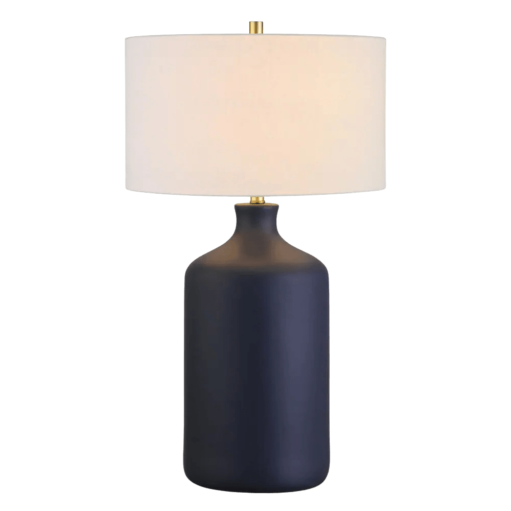 The Columna Ceramic Table Lamp features a tall, bottle-like silhouette with a refined, modern presence. A matte ceramic base in a pure white, deep navy, or slick black tone, topped with a clean cylindrical shade and finished with brass accents create a balanced look, allowing it to fit various color environments.